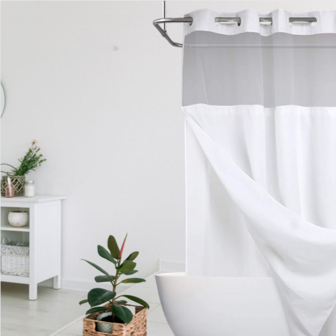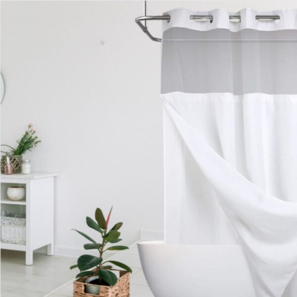 Cortina blanca con un lindo diseño de líneas blancas. No necesita ganchos y su protector es desmontable y lavable.