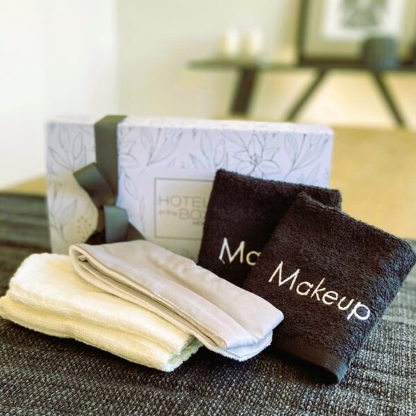 Este Mini Box contiene: Un Turbante de baño, Un Headband para tu skincare y Dos toallas desmaquillates Makeup